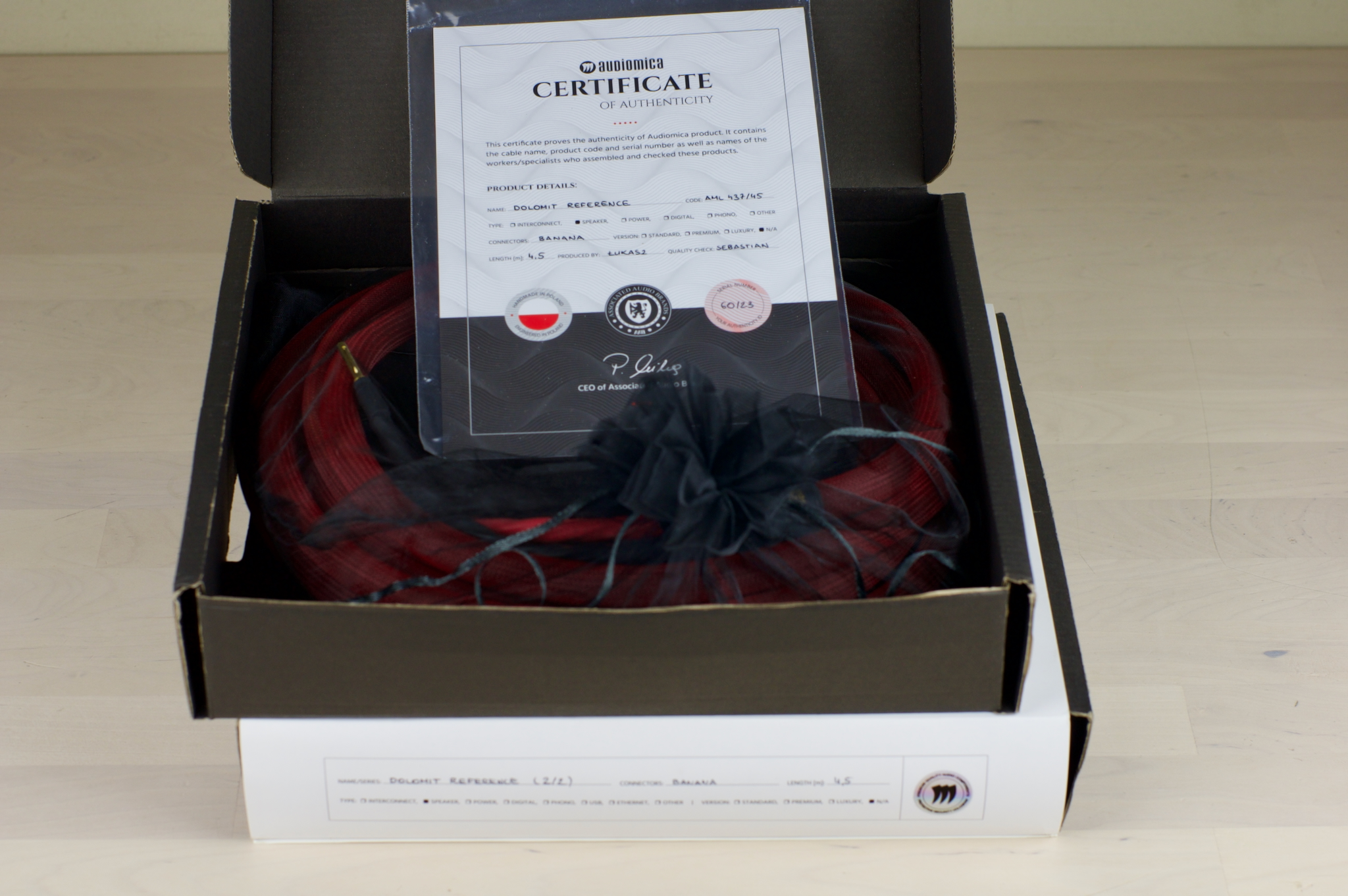 The cable is hand-terminated with gold-plated banana plugs. The original cable is packed in a signed box. The box includes the certificate of authenticity, a brochure with the description of the series, a product code and a personal quality assurance.